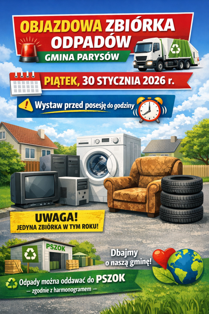 Wójt Gminy Parysów przypomina, że objazdowa zbiórka odpadów wielkogabarytowych, 🛋️ zużytego sprzętu elektrycznego i elektronicznego 📺💻 oraz opon od samochodów osobowych 🚗 odbędzie się: 📅 w piątek, 30 stycznia 2026 r. 👉 Odpady należy wystawić...