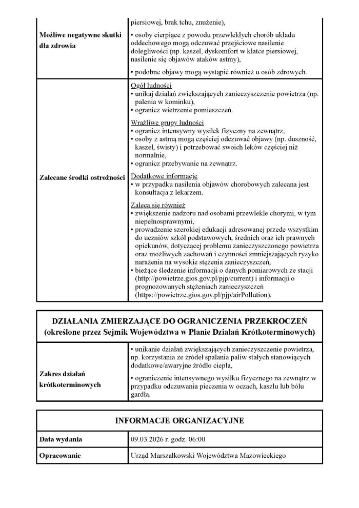 Informujemy, że 9 marca 2026 r. w powiecie garwolińskim istnieje ryzyko przekroczenia dopuszczalnego średniodobowego poziomu pyłu zawieszonego PM10 w powietrzu (50 µg/m³).